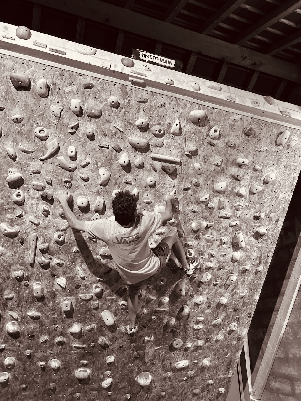 Trouver le bon chemin. Initier le mouvement, depuis la pointe de l’orteil. Placer le bassin, tirer avec le bras gauche, s’aider de l’index et du majeur droit pour rester contre le mur, juste deux dixièmes de seconde supplémentaires. Arriver sur la règle en tendu, retenir le balan. Arquer, prendre soin de verrouiller avec le pouce, monter le pied droit. Coordonner le tout, le temps d’un éclair. Recommencer. Rompre l’équilibre, puis le retrouver.