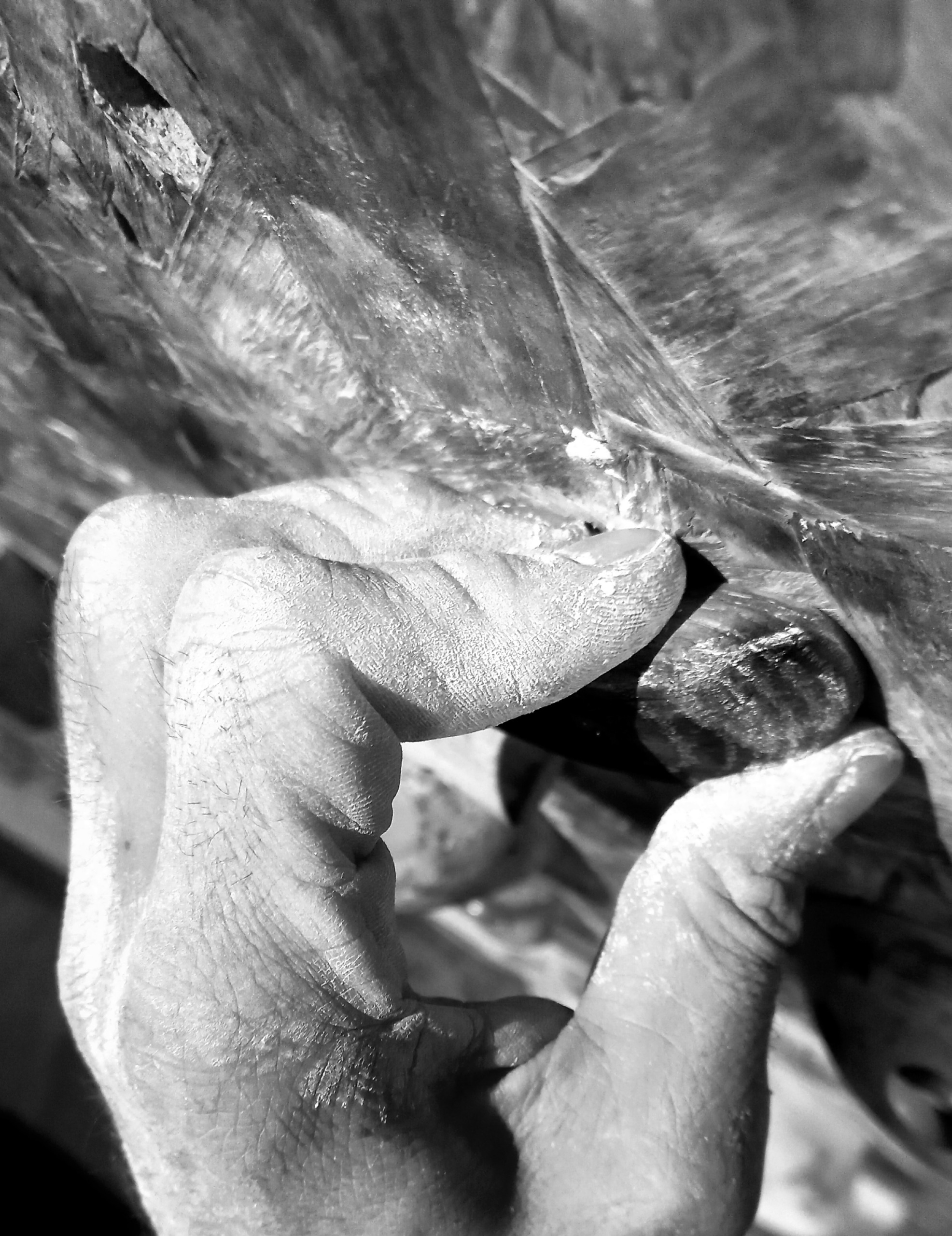 C’est une fin de journée ordinaire comme beaucoup d’autres. L’histoire se répète avec la faveur et la surprise de ne jamais nous ennuyer. Je prends le chemin du Laminoir et débarque dans ce drôle de quartier aux contours un peu flous. Plusieurs mondes semblent y cohabiter, nous aidant ainsi à y passer inaperçus. Je n’y avais jamais mis les pieds auparavant mais il m’est devenu doucement familier avec le temps. J’accroche mon vélo à son fidèle poteau. Il est disponible et ce détail m’indique que je suis certainement le premier arrivé. Par un geste athlétique devenu routinier et aisé avec le temps, je soulève cette vilaine porte de garage, arborée d’un simple sticker gris affirmant notre identité avec discrétion. Elle matérialise l’entrée vers un autre monde. Je me glisse alors dans l'obscurité du lieu qui malgré son silence, semble m’accueillir à chaque fois un peu plus. Le parfum du bois est bien là, complice silencieux de nos rendez-vous quotidiens. Il est mélangé à celui de la poussière et des tapis imprégnés de magnésie, créant ainsi une odeur devenue rassurante et familière. J'appuis maintenant sur l'interrupteur, braquant ainsi avec force la lumière des projecteurs sur notre théâtre d’expression. Il y a toujours cet instant de redécouverte, cette impression écrasante qui nous rappelle que la gravité semble un peu plus forte ici. Je crois connaître les moindres détails de ce mur. Je reste néanmoins un instant à observer notre création à travers des yeux vagues et fascinés comme devant un feu de cheminée. Ces formes uniques que nous avons imaginées et façonnées ont une identité. Parties de rien et vissées là, elles ont maintenant une histoire et participent à la création de gestes inédits. Les premiers contacts avec le bois sont timides et respectueux. L’accueil et l’acceptation conjointe avec l’épiderme peut parfois prendre du temps. Il faut être à l’écoute de chaque contact, de l’orteil à l’index et jusqu’à ressentir le paradoxe de la douceur se mêler à l’intensité des efforts. Le bruit sourd du contact avec le bois précède celui du grincement typique des phalanges qui se ferment avec force sur la prise. Cette signature acoustique indique que le panneau est maintenant prêt à accueillir le grimpeur. Mais cette belle matière qu’est le bois, noble et naturelle, est aussi drastiquement intolérante à la faiblesse. Son exigence nous rappelle que le moindre relâchement nous enverra au tapis. Ces vieux DIMA d’ailleurs, probablement d’anciens occupants de pauvres gymnases scolaires, vivent maintenant leur meilleure vie : ils forment aujourd’hui une sorte d’estrade mettant en valeur une scène qui attend ses artistes. Les voilà enfin qui arrivent. Ces artistes, ces habitués et leur bonne tête, toujours le sourire aux lèvres mais la détermination au fond du regard. Tout le monde semble heureux d’être là, même si personne ne vient vraiment pour prendre du plaisir. C’est en effet une école de l’exigence et de la modestie. Ce laboratoire du geste ne se laisse pas si facilement apprivoiser. Mieux vaut prendre soin de sa relation avec l’échec et laisser son égo aux vestiaires. Par ailleurs, dans ce lieu aux apparences hostiles, la bienveillance règne. Contrairement à beaucoup de salles d’escalade, quand c’est à votre tour de grimper au Laminoir, la place vous appartient. On vous regarde, on vous encourage et on vous soutient. Le résultat n’a pas d’importance. L’important, c’est d’être ici et que vous soyez montés sur scène.